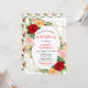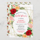 This fun and whimsical bridal shower invitation features watercolor red, pink and orange roses with foliage on a gold geometric frame. The text combines handwritten script and serif fonts for a stylish and modern look. This is perfect for a spring or summer rustic bridal shower.