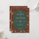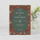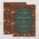 This elegant wedding invitation features a rich, deep red background adorned with intricate floral and bird motifs in shades of orange, pink, cream, and green. The central oval frame is set against a dark green backdrop, creating a striking contrast that highlights the classic serif typography used for the text. The design blends traditional elegance with whimsical touches, perfect for a romantic celebration. With its warm color palette and detailed illustrations, this invitation sets a formal yet inviting tone, ideal for commemorating a significant life event.