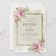 Elegante e romântico, este convite floral apresenta uma cor d'água exuberante florida em tons de rosa, pincel e creme, acentuado com verde e enquadrado por uma angustiada fronteira geométrica de ouro. Comparado a um fundo de lavagem de mola, o design exude o charme e a sofisticação do eterno — perfeito para casamentos de jardim, celebrações rústicas ou cerimônias românticas de resort. Totalmente personalizável com seus detalhes de casamento, este convite combina a tipografia moderna com um toque de arte vintage, fazer que seja uma primeira impressão inesquecível para o seu grande dia.