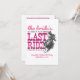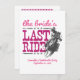 Sim, haw! É hora de celebrar uma última vez antes que esta vaqueira seja apanhada! É a última viagem da noiva antes de se estabelecer, também conhecida como uma solteira ou uma festa de galinha. Design apresenta uma vaqueira correndo em seu cavalo com texto e estrelas distantes da escrita ocidental e gorda. Perfeito para um evento temático ocidental ou country. Mostrada numa combinação de rosa quente e rosa mais macio. Também disponível no estado do Texas, em vermelho e azul. Produtos correspondentes disponíveis.
