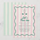 Peça aos seus hóspedes para seguirem uma festa de aniversário no campo de golfe com este convite de festas de picleball elegante e inspirado no vintage. Apresenta um fundo riscado de rosa claro, uma moldura verde ondulada, e uma ilustração de dois tacos de golfe e uma bola de golfe. A parte traseira da placa apresenta um fundo verde-listrado contrastante.