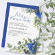 Rosa azul e Eucalyptus Quinceanera convidam Mis Quince Años em caligrafia elegante. O design apresenta arranjos florais de flores rosa, folhas de eucalipto e verde. Se você quiser combinar produtos, navegue na minha coleção ou me envie uma mensagem para adicionar os modelos de design necessários.