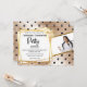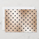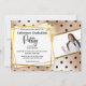 Um fundo de folha de rosa dourado vítreo vibrante com bolinhas de tamanho médio a preto tem um quadro quadrado dourado falso com uma incisão branca na parte superior que está adjacente a um modelo de fotografia para a imagem de formandos. Eles estão conectados por um caducimo dourado falso. Há modelos de fontes pretas para seu texto personalizado na frente e a parte traseira tem o mesmo pano de fundo que a frente. Estes convites fabulosos são ideais para todas as mulheres que se formam em qualquer faculdade ou instalação médica.