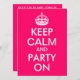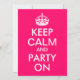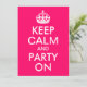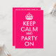 Áreas de texto personalizáveis em uma paródia cor-de-rosa brilhante e branca "Manter calma e festa ligada" para uma festa de aniversário.