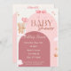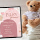 Rosa com Urso e chá de fraldas de balões, arco rosa, estrelas. Editável