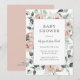 Elegante lanche floral de bebê com uma moldura constituída por rosas pintados de cor d'água em rosa rosa poeirento e verde em tons de verde sábio. Este adorável convite botânico temático é excelente para um primavera ou chá de fraldas de verão.