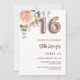 Um convite moderno, na moda e glamouroso para uma festa de aniversário Doce 16, 16. Fundo branco. Decorado com ouro rosa e floral cor-de-rosa. O nome é escrito com um moderno e escuro, rosa dourado, escrito com letra de estilo manuscrito. Personalize e adicione os detalhes da sua festa. O número 16 é escrito com uma fonte de estilo de balão, script.
