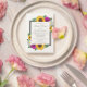 Design apresenta girassóis, rosas e margaridas elegantes com uma paleta de cores amarela, rosa/roxa e branca ouro. Design também apresenta uma estrutura de cinza de carvão. Você pode alterar a cor de fundo na parte frontal e na parte traseira para a cor de sua escolha ou deixar ambas definidas como brancas.