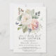 A querida menina a ser está a caminho! Este elegante e feminino convite para chás de fraldas de cottagecore apresenta um rosa branco selvagem com um rosa inglês antigo e de pêssego com o hálito do bebê, uma borboleta azul minúscula e uma libélula. O design tem um fundo de textura de papel aquoso e o verso tem um design floral coordenador e suas informações de código QR e site (que podem ser excluídas se você não precisar). Existe uma coleção completa de produtos disponível para coordenar: MSP0107