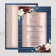 Rosas de borgonha em rosa dourado e fundo de textura de madeira azul de marinho.