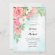 Belas rosas, tulipas, anêmona, flores cosmos com folhas e galhos formando buquês ricos. Turquesa aquarela ombre. Toneladas de rosa, pêssego, verde, turquesa. Trabalho de arte de aquarela de arte. Inscrição elegante. Elementos geométricos modernos. Design de casamento alegre e festivo, ideal para o casamento de verão. O rosa (coral) e a turquesa é um tema clássico de cor de eterno.