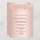 Um convite moderno, na moda e glamouroso para a festa de aniversário de uma mulher. Um fundo rosa dourado com gotas. O nome é escrito com um moderno e escuro, rosa dourado, escrito com letra de estilo manuscrito. Modelos para os detalhes da sua festa.