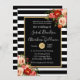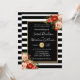 Este convite de casamento espetacular e impressionante apresenta riscas brancas e pretas em negros com uma trilha de ouro e flores rosa e vermelha. As rosas vermelhas rosa e papoilas realmente pop e cantam maravilhosamente neste maravilhoso convite para o casamento.