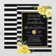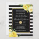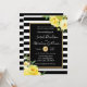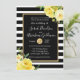 Este convite de casamento impressionante e impressionante apresenta riscas brancas e pretas arrojadas com uma trilha de ouro e flores amarelas. As rosas amarelas realmente pop e cantam maravilhosamente neste maravilhoso convite para o casamento.