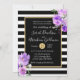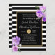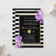 Este convite de casamento espetacular e impressionante apresenta riscas brancas e pretas arrojadas com uma trim de ouro e flores roxas. As flores lavandas realmente pop e cantam maravilhosamente neste maravilhoso convite para o casamento.