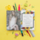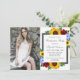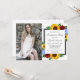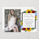 Design apresenta girassóis, rosas e flores silvestres elegantes com uma paleta de cores amarela, vermelha e azul-claro ouro. Design também apresenta uma estrutura de cinza de carvão. Você pode alterar a cor de fundo na parte frontal e na parte traseira para a cor de sua escolha ou deixar ambas definidas como brancas. Modelo de foto licenciado via Pixabay sob CC0 e deve ser substituído por sua própria foto