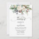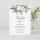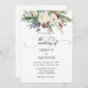 O verde do pinheiro com rosas brancas faz um elegante convite para casamento floral para uma data de casamento no inverno. Mais acentuado com bagas sutis e cones de pinho. A caligrafia aproveita a design para separá-la de forma simples, mas eficaz. É feminina e na moda, com uma paleta editada de branco, cor de rosa profundo e vermelho suave.