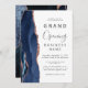 Convide os clientes para a grande abertura da sua empresa com este elegante convite moderno, com uma marinho azul de aquarela agata bordada com falso brilho rosa de ouro. O texto personalizável combina a escrita manual de cinzas de carvão, as fontes em copperplate e itálico em um fundo branco. O verso apresenta um design marinho de agate azul e rosa dourado correspondente.
