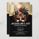 Uma bela máscara falsa de ouro tem vermelhos à volta do topo dos olhos; filigre floral decorativo no meio; penas rosas vermelhas e suaves pretas, vermelhas e douradas no topo que descansam contra um cinzeiro falho, ouro cintilante e fundo preto. Modelos de texto editáveis em branco são exibidas abaixo do gráfico aquarela para sua redação personalizada. Este design é ideal para uma solteira, chá de panela, aniversário, 16 anos, glama e luxuosa; festa do marco ou quinceanera. Simplesmente personalize os modelos de texto editáveis para se adequar à sua ocasião especial.