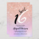 Bonito convite de aniversário Sweet 16 com brilho falso de rosa de cobre, fundo pastel roxo e letra elegante de caligrafia.