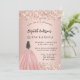 Um convite moderno, na moda e glamouroso para uma Quinceañera, festa de aniversário 15. Um fundo rosa de ouro com poeira falsa de ouro, uma garota vestindo um vestido de bola. O nome é escrito com um moderno estilo escrito à mão. Personalize e adicione os detalhes da sua festa.