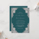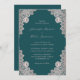 Estes elegantes convites de rosa e casamento teal com rendas florais de ouro rosa num fundo negro são perfeitos para convidar os seus convidados para a sua festa de casamento rústica de ouro e rosa.