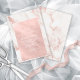 Um fundo de abstrato que lembra o mármore brilhante em tons de ouro rosa é o pano de fundo para o texto elegante e os layouts modernos de design nos pedaços desta bela suíte de casamento. O convite do janto de ensaio de casamento mostrado aqui apresenta um rosa de ouro e mocha, um inset de aquarela delimitado por um mármore elegante como pano de fundo para o texto dourado. Adicione facilmente os detalhes do evento usando o modelo fornecido. Procure ID816 para ver outras peças e opções de cores para este conjunto.