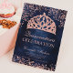 Um confete glitter rosa de ouro quico e luxuoso em cimento azul-água marinho com tipografia elegante da caligrafia Quinceañera convite de aniversário, com uma princesa luxuosa desenhada à mão, a coroa tiara rosa. Adicione sua foto.