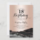 Ouro preto e rosa agate 18º convite de aniversário. Elegante design moderno com fundo geode de pedra de pedra, rosa dourado falso e letra de script de tipografia. Trendy convida o cartão perfeito para uma comemoração de dia das mulheres na moda. Impressos convites Zazzle ou modelo de impressão digital instantânea para download.