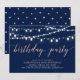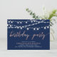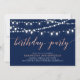 Celebre seu dia especial com este modelo de convite de aniversário moderno e sofisticado. Este design apresenta belas luzes de corda com um tema de cores rosa dourado e azul marinho.