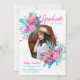 Rosa dourado, imagem geométrica e tipografia de confete com brilho, convite para festa de formatura com ramos de folha de cor verde pintados à mão, flores rosa e turquesa. Carregue sua foto.