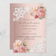Para uma recepção de casamento elegante e romântica. Um fundo rosa de gradiente dourado decorado com florais, rosas e rendas de ouro rosa e rosa. Personalize e adicione seus nomes e detalhes.