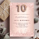 Um convite moderno, na moda e glamouroso para a 10ª festa de aniversário de uma menina. Um fundo rosa de ouro falso com pingos, pintura com pingos. O nome é escrito com um moderno e escuro, rosa dourado, escrito com letra de estilo manuscrito. Personalize e adicione os detalhes da sua festa. O número 10 é escrito com uma fonte de estilo de balão, script.