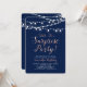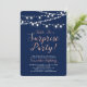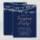 Celebre um dia especial com este convite de aniversário surpresa moderno! Este design apresenta a tipografia de na moda com texto rosa dourado e cordas leves. Perfeito para uma festa de jardim, uma festa de quintal ou uma festa temática de cor ouro e marinho.