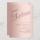Um 16 convite moderno. fundo rosa de gradiente dourado e a palavra dezesseis escrita com letras grandes. Personalize e adicione um nome e detalhes da parte.