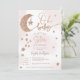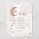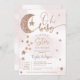 Querida! Uma pequena estrela está a caminho! Um elegante, adorável e fofo Rosa ouro brilhante estrelas da lua nuvens, oh convite de chá de fraldas com bonito lua reluzente com uma estrela pendurada, um aglomerado de estrelas com cor-de-rosa claro pastel e nuvens de água cinza com uma elegante tipografia de letra de pincel. Gravidez chá de fraldas neutra do ponto de vista do gênero, com a indicação de rosa, cinza, ouro e rosa,