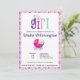 Uma placa de chá colorida e divertida de menina branca com as palavras É uma garota apresentando um bebê adorável em uma carruagem rosa de bebê.