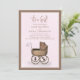 Este design apresenta um lindo bebê rosa-rosa, com uma redação de chá de fraldas feminino, com registro de presentes e código QR para o site da loja online URL, e um clássico Buggy da carruagem de bebês, com elegante tipografia de escrita de caligrafia, uma moderna menina aquática clássica, um simples modelo de estilo mínimo minimalista, para convites para chás de bebês, um clássico estilo vitoriano clássico e bonito. mamãe para ser mãe, um clássico convite para o chá de bebê