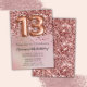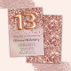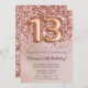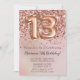 Convite de aniversário elegante rosa de 6 de ouro para uma menina de 13 anos com roteiro elegante escrevendo com fonte preta e balões de folha divertida.