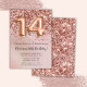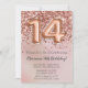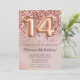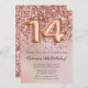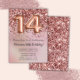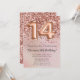 Convite de aniversário elegante de ouro rosa para uma menina de 14 anos com roteiro elegante escrevendo em letra preta e balões de folha divertida.