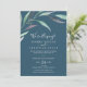 Este cartão de recepção de casamento fuga azul com eucalipto roxo e verde é perfeito para uma festa pós-casamento fuga moderna no quintal. O design botânico simples e elegante apresenta folhagens em aquarela com acentos de lavanda e roxo escuro em um fundo azul-marinho. Os cartões de RSVP são vendidos separadamente.