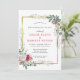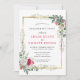 Uma grande estrutura dourada envolve seus detalhes de festa de noivado. É decorada com rosas vermelhos e brancos aninhados em bagas ocas, folhas de eucalipto e folhagem botânica de inverno. Este belo convite faz parte de uma coleção que tem modelos para você criar convites e suprimentos de festas.