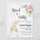 Um convite moderno, na moda e glamouroso para um Chá de panela de bolinho. Um fundo branco com bolhas, um par de flautas, óculos, uma flor de ouro rosa e um verde de eucalipto. O nome é escrito com um moderno estilo escrito à mão. Personalize e adicione os detalhes da sua festa.