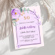 Um fundo rosa bege com um arco roxo. Decorado com um floral rosa, flor de rosa, eucalipto verde aquarelado e borboletas. Personalize e adicione seu nome e detalhes da festa.