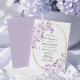 O convite da Primeira Comunhão elegante e feminina apresenta belos rosas roxos de lavanda pálida e flores brancas de magnólia que decoram uma estrutura de ouro oval. Todo o texto é editável para que você possa usá-lo para qualquer tipo de cerimônia religiosa, Batismo, Cristo, Dedicação ou Confirmação.
