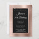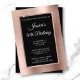 Crie o seu próprio convite para comemoração de aniversário do na moda, estilo 5x7, para ela. O fundo decorativo apresenta uma folha de ouro rosa e uma cobertura retangular preta sólida. Mova ou exclua o gráfico cintilante branco sujo. Personalize os estilos de fonte branca, cor e tamanho. A folha de alumínio moderna é criada com elementos de arte digital que impressão gostam de uma foto. Fabuloso convite para o seu melhor amigo.