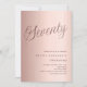 Um convite moderno e na moda para uma festa de aniversário 70. fundo de gradiente rosa dourado e a palavra Setenta escrita com letras elegantes de grandes guiões em rosa dourado escuro. Personalize e adicione um nome e detalhes da parte.
