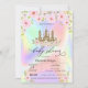 Rosas cor-de-água rosa e castelo com brilho dourado em fundo holográfico. Esses convites para chuveiros de bebês são facilmente personalizados para seu evento simplesmente adicionando seus detalhes.