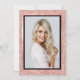 Esses convites de festas de formando de na moda 2019 apresentam uma aparência falsa de rosa dourado (note que não é uma falha real, mas uma imagem de brilho) e um quadro preto central, com um script manual de correspondência moderno para uma nova aparência de tendência. A foto do formando vai para trás.