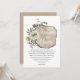 O convite para o casamento floral de cor d'água do inverno é 'boho chic' rústico inspirado em uma fatia de madeira e uma folhagem natural de tons de terra. Elegante de rosas brancos, folhas de sábio, eucalipto e cones de pínus decoram a seção de fatia de madeira com seus anéis anuais para representar uma relação forte e duradoura. A parte traseira do convite exibe um impressão marrom de papel kraft para adicionar ao encanto rústico.